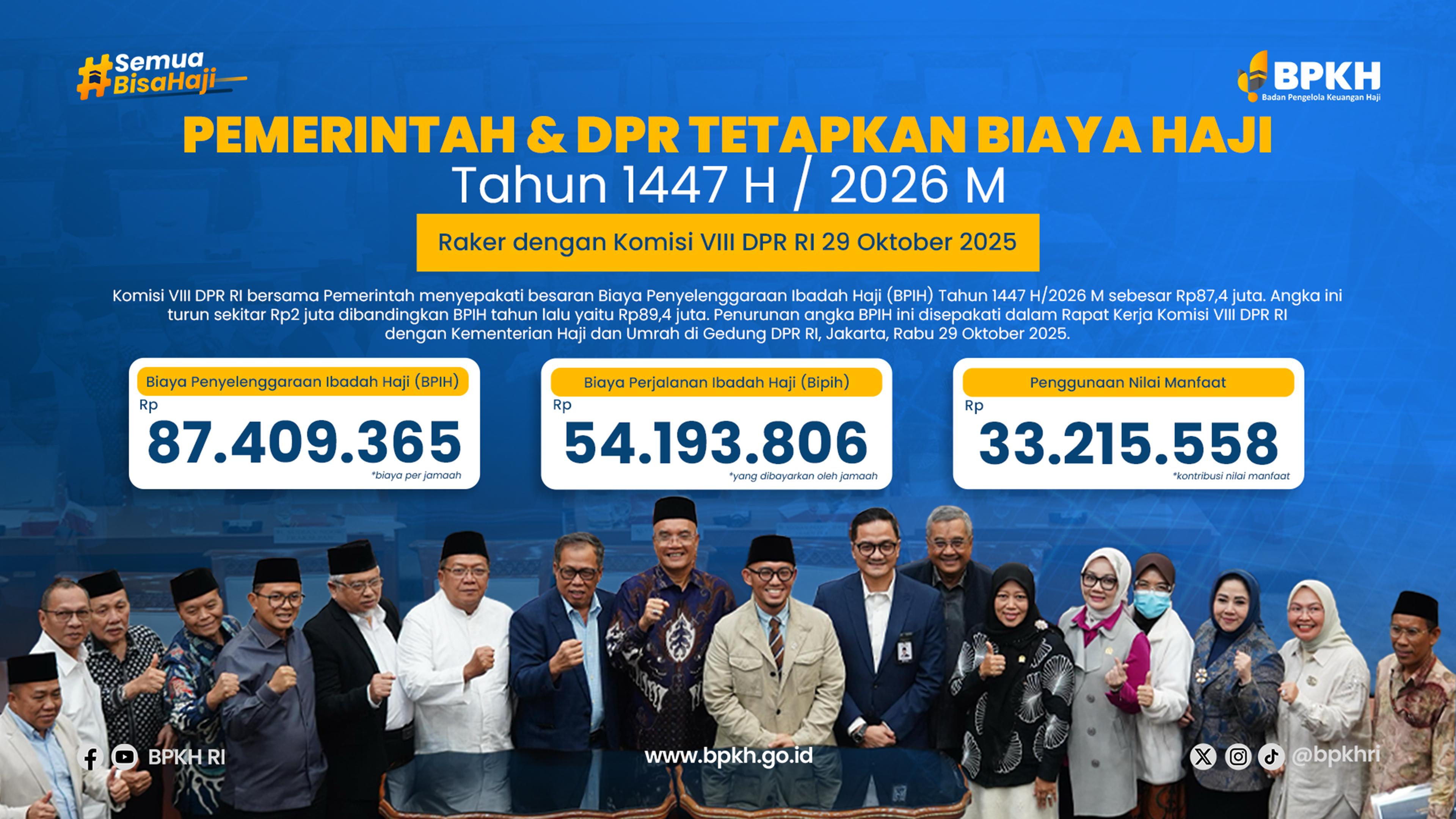 Komisi VIII DPR RI bersama Pemerintah menyepakati besaran Biaya Penyelenggaraan Ibadah Haji (BPIH) Tahun 1447 H/2026 M sebesar Rp87,4 juta. Angka ini turun sekitar Rp2 juta dari BPIH tahun sebelumnya yang mencapai Rp89,4 juta. Kesepakatan dicapai dalam Rapat Kerja Komisi VIII DPR RI dengan Kementerian Haji dan Umrah, 29 Oktober 2025.