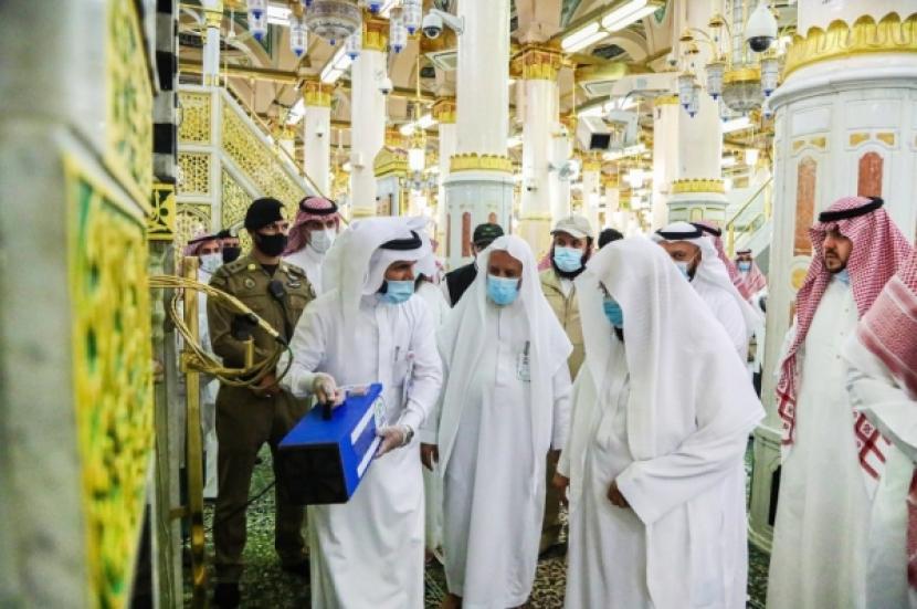 IHRAM.CO.ID,MADINAH -- Presidensi Umum Urusan Dua Masjid Suci telah menggunakan 23.383 liter deterjen ramah lingkungan untuk mensterilkan karpet koridor Al-Rawdah Al-Sharifah dan Bab Al-Salam (Gerbang Al-Salam) di Masjid Nabawi, Madinah. Penggunaan deterjen untuk mensterilkan karpet masjid ini dilakukan selama tiga bulan terakhir. Di sisi lain, Karpet yang berada di Al-Rawdah Al-Sharifah diganti setiap 10 hari. Dilansir di Saudi Gazette, Senin (15/3), pihak berwenang berupaya melakukan tindakan preventif dan pencegahan penyebaran Covid-19, dengan menempatkan 300 tanda jarak fisik di seluruh wilayah koridor Al-Rawdah Al-Sharifah dan Al-Salam Gate. Tindakan ini dilakukan sebagai bagian dari upaya berkelanjutan untuk mensterilkan dan mendisinfeksi Masjid Nabawi dan halamannya, untuk meningkatkan tindakan pencegahan dan layanan yang disediakan bagi pengunjung Masjid.